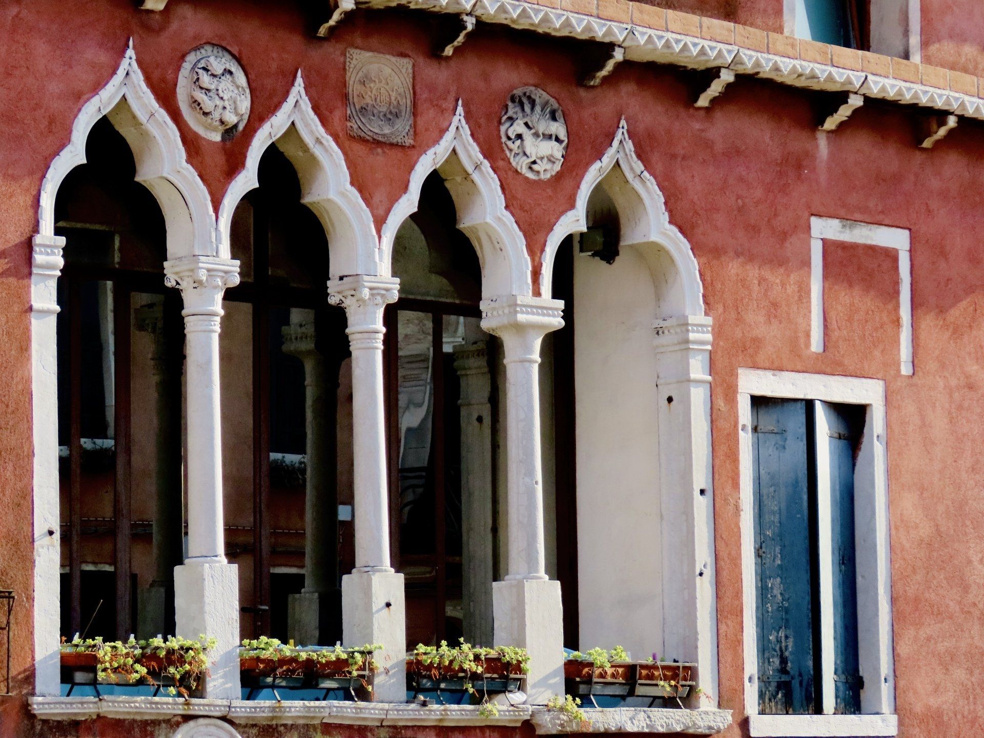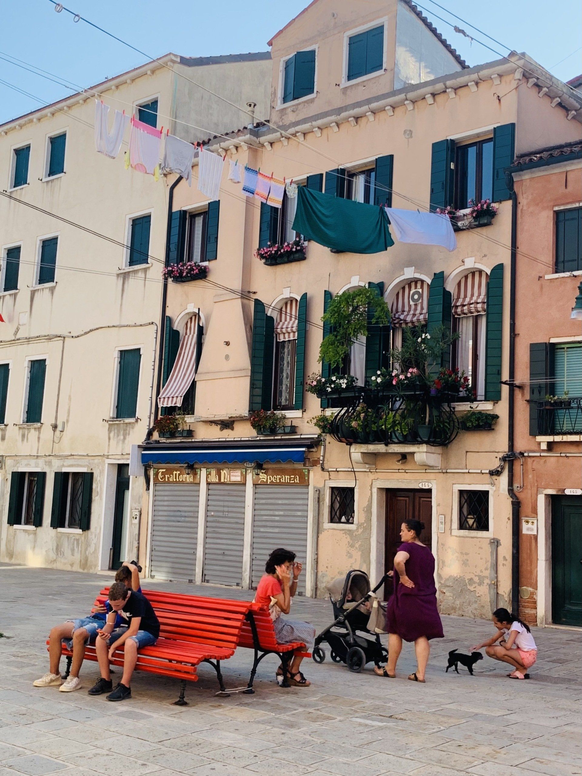 23. Juli 2021 - ... und zwar die größte aller Inseln von Venedig. Sie wird dem Sestiere (Stadtteil) Dorsoduro zugeteilt, dem "harten Rücken" Venedigs (so genannt nach dem Felsgestein, auf dem es erbaut wurde) und sie liegt südlich vom Stadtzentrum Venedigs entfernt, auf der anderen Seite des gleichnamigen Kanals, dem "Canale della Giudecca". Obwohl sie vom Markusplatz mit dem Vaporetto in nicht mehr als 4 Minuten zu erreichen ist, wissen viele Touristen nicht einmal, dass auch diese Insel zu Venedig gehört. Auf einer "Tourist Map", die ich mir im Mai am Parkplatz Tronchetto kaufte, ist sie überhaupt nicht mehr drauf! Dieser Touristen-Stadtplan endet am unteren Rand mit der Fondamenta Zattere, der Promenade von Dorsoduro am Giudecca-Kanal. Mir gefällt das. Und ich bin vor allem deshalb hier so glücklich, weil auf der Giudecca deutlich weniger los ist, als auf dem viel bekannteren "Centro Historico" Venedigs. Giudecca hat auch einen völlig anderen Charakter. Den Unterschied in der Atmosphäre nimmt ein aufmerksamer Beobachter sofort wahr, wenn er an einem der fünf Vaporetto-Stationen aussteigt. Da die Insel aus der Vogelperspektive an eine lange Fischgräte erinnert, bürgerte sich in früherer Zeit unter den Einwohnern auch der Name "Spinalonga" für die langgestreckte schmale Insel ein. Eigentlich besteht Giudecca aus 8 Einzelinseln, die durch breite Kanäle voneinander getrennt und durch kleinere und größere Brücken verbunden sind. Mich interessiert, woher der heute gültige Name "Giudecca" kommt und ich habe herausgefunden, dass über die Bedeutung des Namens nach wie vor gerätselt wird. Die einen meinen, sie wäre nach den Juden (italienisch früher "guidei", heute "ebreo") benannt, da den Juden im Mittelalter zuerst auf dieser Insel zu siedeln erlaubt wurde, statt in Venedig selbst. (Später sollten sie sich dann im ersten "Ghetto" der Welt im Sestriere Cannaregio niederlassen) Andere vertreten eher die These, dass die Übersetzung des Namens Giudecca eher vom Wort "zudega" (Verurteilter) stammt und sich auf die Gaunerfamilien aus Venedig bezieht, die im 11. Jahrhundert auf diese Insel verbannt wurden. Was aber ist nun das Besondere und Andersartige an Giudecca im Vergleich zur Hauptinsel? Aus meiner Sicht ist es die größere Ruhe, die fehlende Hektik und Lautstärke, es sind die meist weit weniger spektakulär aussehenden Häuser dieser ursprünglich Arbeiter- und Industrie-geprägten Insel und vor allem das Leben der Menschen hier. Es dominiert nicht so sehr der Tourismus wie "drüben", sondern man kann noch sehr gut das ganz normale, lokale Leben der einheimischen Bewohner beobachten. Wir haben dazu das Glück, dass die vier Fenster unserer Wohnung auf einen kleinen Kanal und den gleichnamigen kleinen Platz, den Campo della Pallada, schauen. Beim Frühstück genossen wir unsere wunderschöne Aussicht vor allem deswegen, weil der Blick aus dem großen Fenster wie der auf eine Bühne wirkt, auf der sich das ganz normale venezianische Leben abspielt. Da war heute zuerst zu sehen, wie sich die Müllmänner abmühen müssen, um ihre Korbwagen über die Stufen der kleinen Holzbrücke zu schaffen und dann war ein Umzug auf venezianisch zu beobachten. Da die Kisten und Möbel unmöglich über den Hausflur des schmalen Hauses transportiert werden können, lehnte am obersten Fenster ein zerlegbarer(!) Schrägaufzug, über den die Sachen erst einmal auf die Straße geschafft wurden, um dann von mehreren Helfern auf das Boot gestapelt zu werden, das an unserem Canale della Pallada bereitstand.