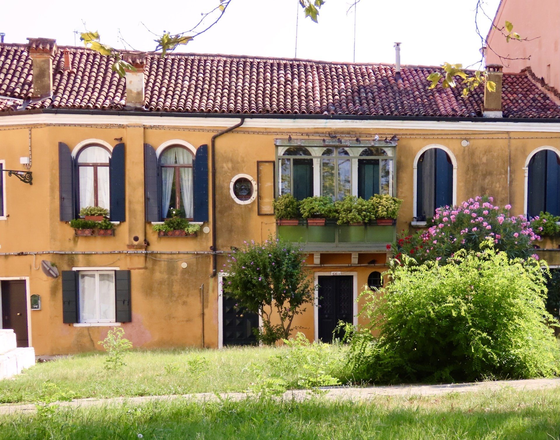 25. Juli 2021 - Ein Freund fordert mich dazu auf, unbedingt auch einmal von zwischenmenschlichen Erlebnissen in meinem Blog zu erzählen. Das fällt mir jetzt nach dem noch relativ kurzen Aufenthalt hier auf der Insel natürlich noch schwer. Aber das ein oder andere könnte ich vielleicht doch schon erwähnen: Sowohl das letzte Mal im Mai, als auch jetzt wieder im Juli habe ich/ haben wir, Chris und ich, ganz erstaunlich schnell Kontakt zu den Menschen hier bekommen. Das erzeugte in mir gleich so ein heimelig-warmes Gefühl und es hat uns beide jedesmal wirklich völlig überrascht und begeistert! Ich bin ja eher schüchtern und tue mir leider etwas schwer damit, neue Leute kennenzulernen - Chris dagegen ist da ganz anders: er kann mit Leichtigkeit auf Leute zugehen... aber so war es nicht, als wir hier zum ersten, nein zum wiederholten Male, Kontakt zu netten Venezianern bekamen. Immer wieder gehen Menschen, die hier leben, ganz unerwartet auf uns zu! Ist das nicht ganz erstaunlich? Im Mai schon - als man gerade wieder, aber noch mit großen Einschränkungen nach Italien reisen konnte und wir das erste Mal auf der Giudecca wohnten, aber mehr im Neubaugebiet nahe der äußeren Lagunen-Seite, da hatten wir die erste solche Begegnung. Als wir beim Verlassen unserer Wohnung dort im 2. Stock durchs Treppenhaus gingen, sah ich durch das große Fenster im Zwischengeschoss und da fiel mein Blick auf den gegenüberliegenden kleinen Vorgarten, in dem eine Gruppe von vielleicht fünf oder sechs Menschen in augenscheinlich gemütlicher Vertrautheit um einen Tisch herum saßen. Da mich dieses Bild von oben ad hoc mit Sehnsucht erfüllte, nach dem langen Verbot, sich mit mehreren Menschen gleichzeitig in fröhlicher Runde zu treffen, machte ich spontan ein Foto. Es sah eigentlich nicht so aus, als ob einer der Menschen da unten das bemerkt hätte, aber es passierte doch, dass sich in dem Moment, als wir die Haustür hinter uns schlossen, die Gartentüre gegenüber öffnete und wir mit großer italienischer Herzlichkeit eingeladen wurden, hereinzukommen und uns mit an den Tisch zu setzen. Nur zu gerne folgten wir der Einladung und nahmen auf den schnell herbeigeholten Stühlen ebenfalls Platz am großen Tisch, wo uns sofort ein gefülltes Weinglas vorgesetzt wurde. Natürlich wurde angestoßen, jeder stellte sich kurz vor und wir beide mussten erzählen, wann und wieso wir hergekommen waren, wie lange wir bleiben wollten und was wir so alles vorhätten. Wir gaben gerne Auskunft und erzählten, da einer in der Runde deutsch verstand, eine Dame gut Englisch sprach und ich zum ersten Mal ein paar Brocken Italienisch anbringen wollte, in drei Sprachen durcheinander. Es war herrlich! Es kam soviel Gastfreundschaft und ehrliches Interesse aneinander rüber und die Stimmung war einfach fantastisch. Nach etwa einer Stunde verabschiedeten wir uns mit großem Hallo und vielen guten Wünschen. Wir vereinbarten auch gleich, uns im Sommer unbedingt wiederzusehen und dann gemeinsam - wie die Nachbarn im Viertel das hier regelmäßig tun - direkt am Wasser im Sonnenuntergang über der Lagune eine Art Picknick zu veranstalten, zu dem einfach jeder einen Stuhl zur Kaimauer mitbringt, dazu Wein und Leckereien zum Verteilen. Diese Szene blieb uns als wichtige Erinnerung unseres ersten Aufenthalts auf der Giudecca eingebrannt im Gedächtnis und selbstverständlich werden wir die neugewonnenen Freunde demnächst wieder aufsuchen. Schon am dritten Tag unseres Aufenthalts jetzt im Juli hier auf "unserer" Insel gleich wieder ein Kennenlernen. Auf dem Weg zum Vaporetto wurden wir in einer kleinen Seitengasse spontan von einem netten Herrn angesprochen und in seinen schönen kleinen privaten Garten auf ein Bier eingeladen. Dieses Mal bekamen wir von einem begeisterten Kunsthistoriker, wie sich herausstellte, viele wertvolle Tipps, was wir auf der Giudecca nicht versäumen dürften, zu besichtigen. Kaum um die Ecke auf der Fondamenta (Uferpromenade) am Giudecca Kanal angekommen, wurden wir schon wieder angesprochen: dieses Mal war es eine sehr sympathische und besonders gut gekleidete ältere Dame, eine Deutsche aus dem Schwarzwald, die sich als die Ilse vorstellte. Weil sie uns deutsch sprechen gehört hatte und sich gerne einmal wieder in ihrer Muttersprache unterhalten wollte, erklärte sie, hat sie uns angesprochen. Freundlich erzählte sie uns, wie es sie vor 50 Jahren nach Venedig verschlagen hatte, weil sie ihren Mann hier kennengelernt hatte und dass er nach der Heirat partout nicht mit in ihre Heimat nach Deutschland kommen wollte, dass so auch ihre Kinder hier aufgewachsen sind und sich diese als Erwachsene ganz in der Nähe, in Venedig, niedergelassen haben. Ich weiß nicht, ob wir beide etwas Besonderes ausstrahlen, was immer wieder zu solch schönen Begegnungen führt, aber ich will jetzt erst einmal glauben, dass es einfach an der Gastfreundschaft der Guideccaner, oder der Italiener liegt, dass wir so leicht Anschluss kriegen. Auf jeden Fall erzeugt es in mir immer mehr ein Gefühl von willkommen-Sein und genau das habe ich mir natürlich sehr gewünscht, als ich jetzt wieder ...und dieses Mal für länger... hier auf die Insel kam.