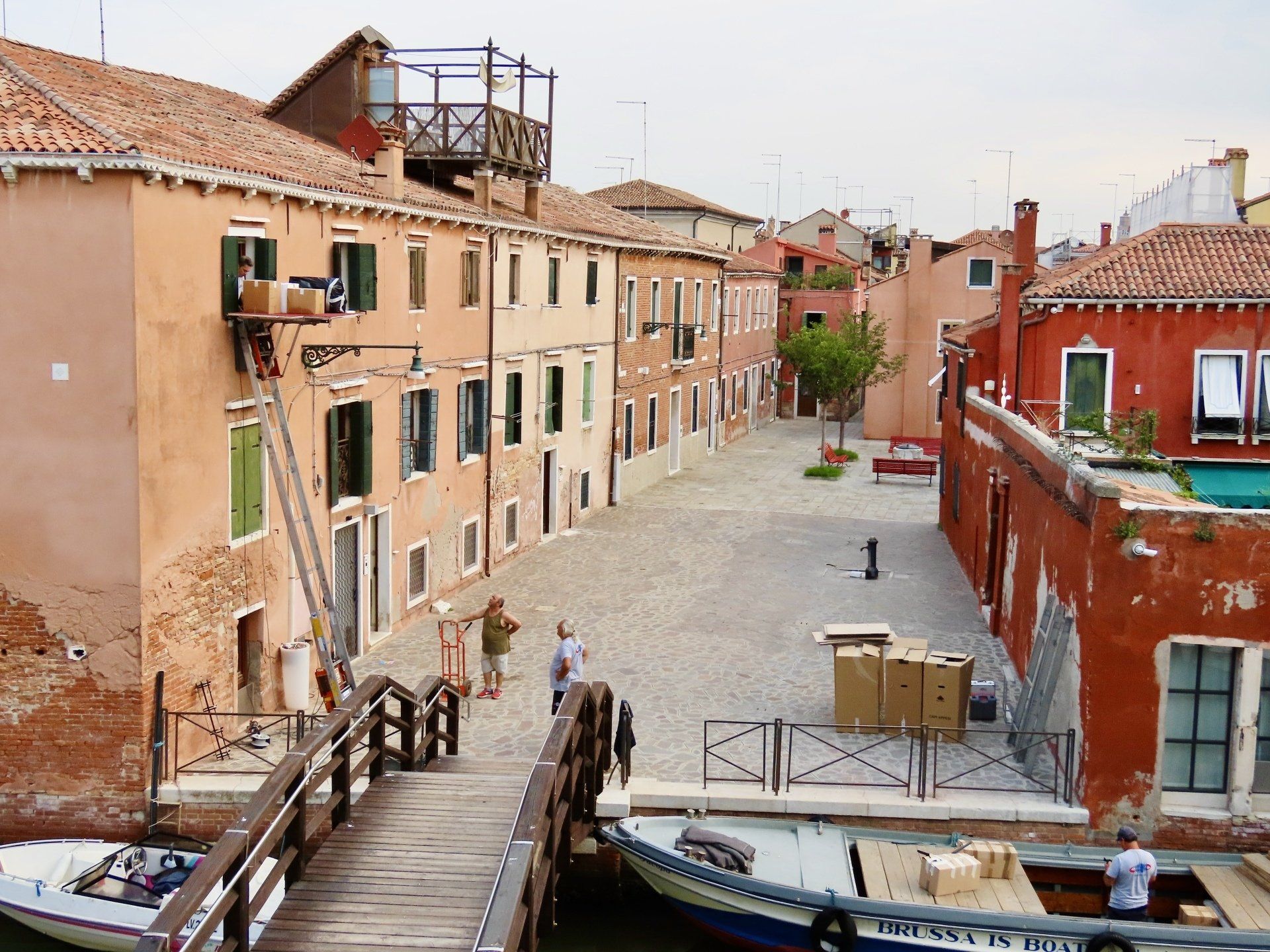 Beim Frühstück genossen wir unsere wunderschöne Aussicht vor allem deswegen, weil der Blick aus dem großen Fenster wie der auf eine Bühne wirkt, auf der sich das ganz normale venezianische Leben abspielt. Da war heute zuerst zu sehen, wie sich die Müllmänner abmühen müssen, um ihre Korbwagen über die Stufen der kleinen Holzbrücke zu schaffen und dann war ein Umzug auf venezianisch zu beobachten. Da die Kisten und Möbel unmöglich über den Hausflur des schmalen Hauses transportiert werden können, lehnte am obersten Fenster ein zerlegbarer(!) Schrägaufzug, über den die Sachen erst einmal auf die Straße geschafft wurden, um dann von mehreren Helfern auf das Boot gestapelt zu werden, das an unserem Canale della Pallada bereitstand.